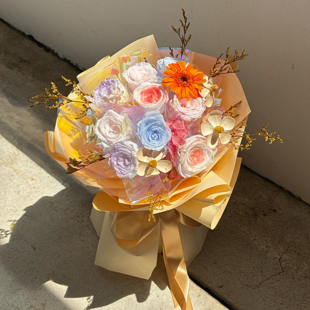 Bouquet includes preserved flowers:
